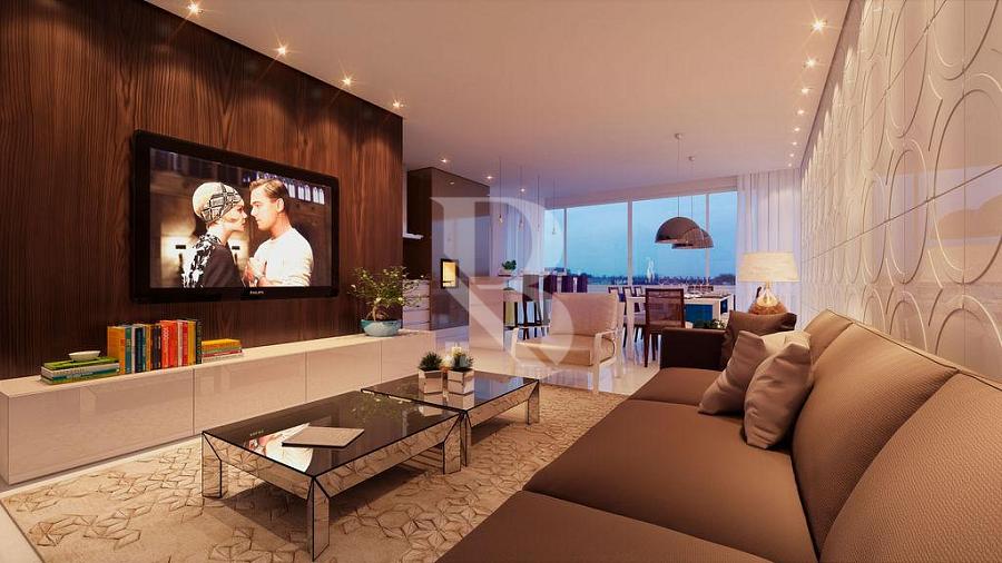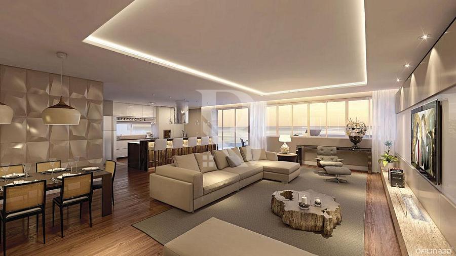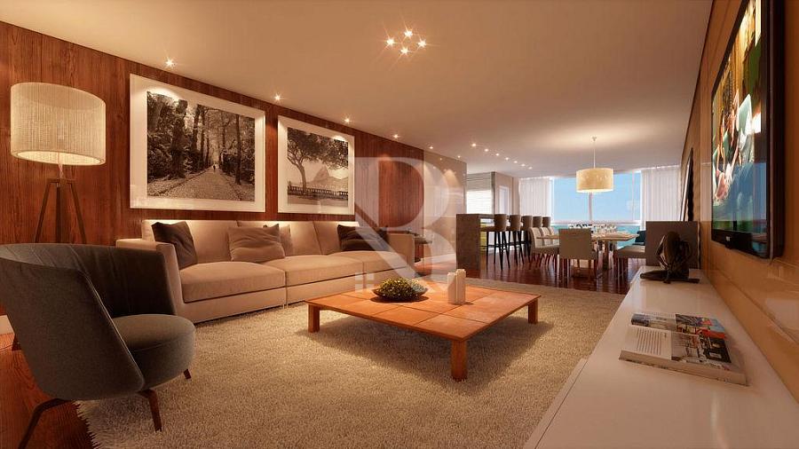 A área social é composta por ampla sala de estar integrada com sala de jantar, além de uma sacada espaçosa com vista para o mar, ideal para momentos em família ou para receber convidados com conforto e sofisticação.