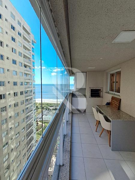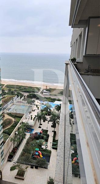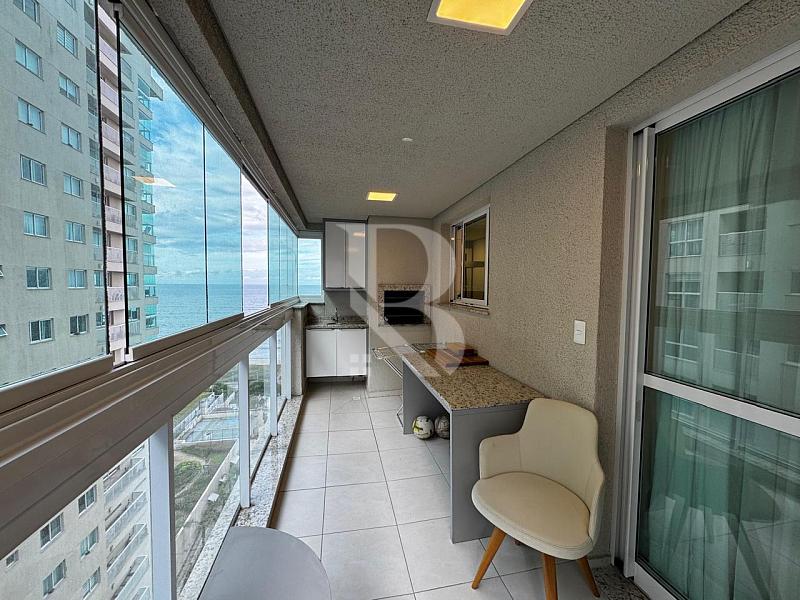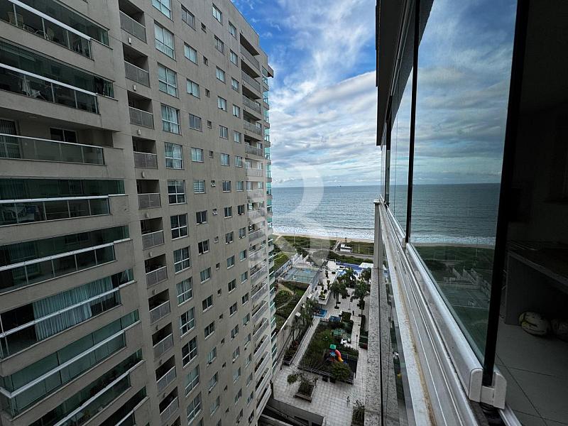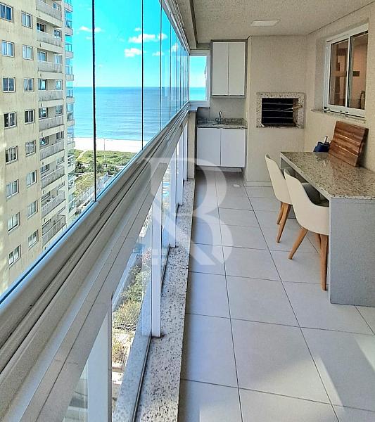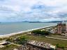 Apartamento frente mar, andar alto, vista panorâmica, sacada com churrasqueira e acesso direto à praia.
