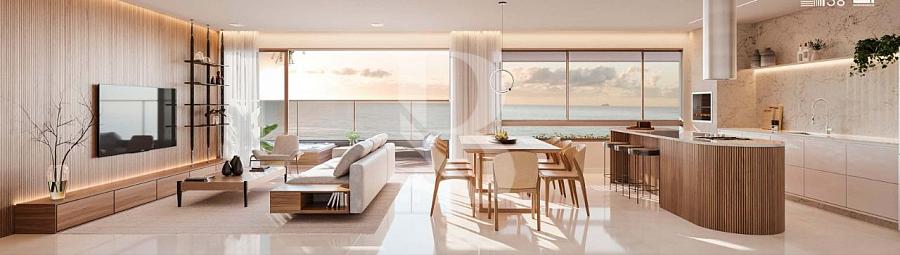 • Living amplo e integrado, com sensação de mansão suspensa frente mar;